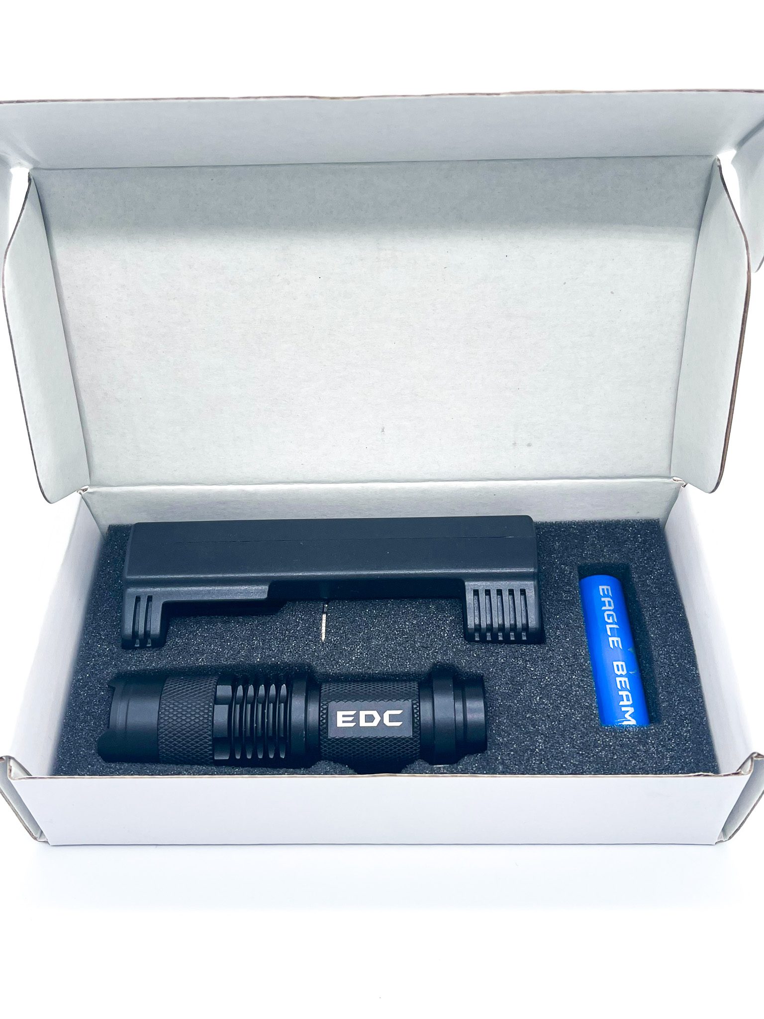 The EDC is the perfect flashlight for all your every day uses like walking the dogs, home inspections, working, and other leisure activities etc. It is a small pocket sized flashlight that packs a serious punch with 500 Lumens, and it has a zoomable beam up to 150 yards, making it worthy of the EDC title. It comes with a rechargeable AA Lithium battery (14500) and a wall charger, but it will run off a regular double AA just as well! The versatility, compact size, and recharge-ability make The EDC a great choice for any of your next adventures! Get yours today!